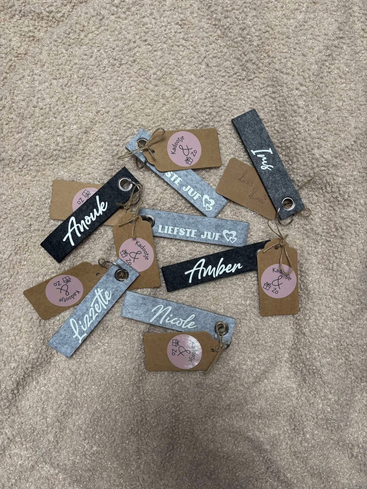 Gepersonaliseerde vilten sleutelhanger met opdruk of naam naar keuze.